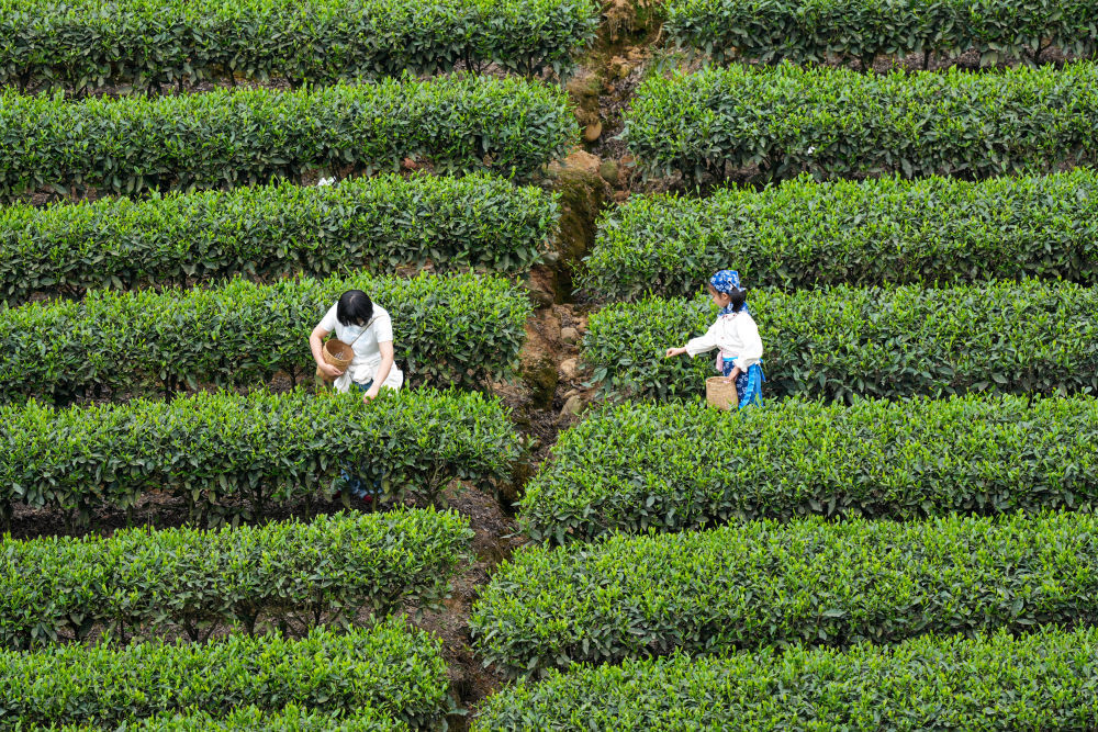 4月5日,人们在四川省雅安市牛碾坪万亩观光茶园体验采茶。新华社记者胥冰洁 摄
