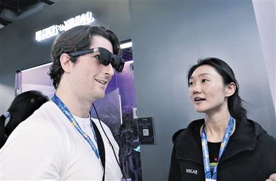 图为2026中国家电及消费电子博览会(AWE)上欧美亚洲综合精品一区,参观者(左)在东方枢纽展区现场体验一款智能眼镜产品。记者 方喆 摄